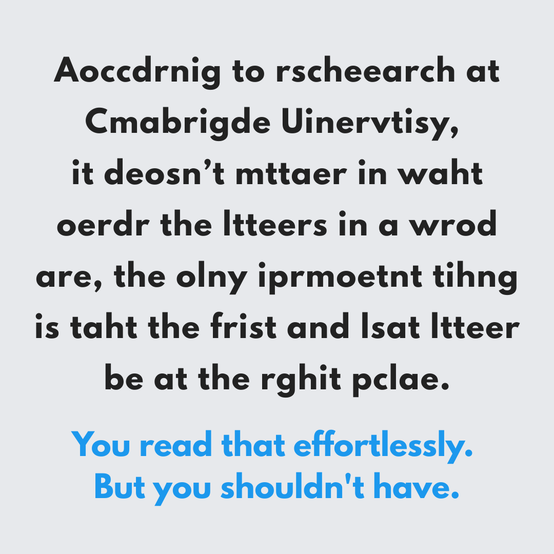 Aoccdrnig to rscheearch at Cmabrigde Uinervtisy, it deosn’t mttaer in waht oerdr the ltteers in a wrod are, the olny iprmoetnt tihng is taht the frist and lsat ltteer be at the rghit pclae.